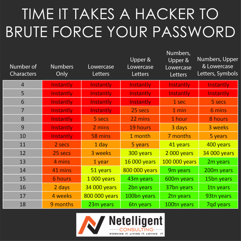 Weak passwords can be cracked within seconds! Take a look at the chart below to see how your strong current passwords are.
